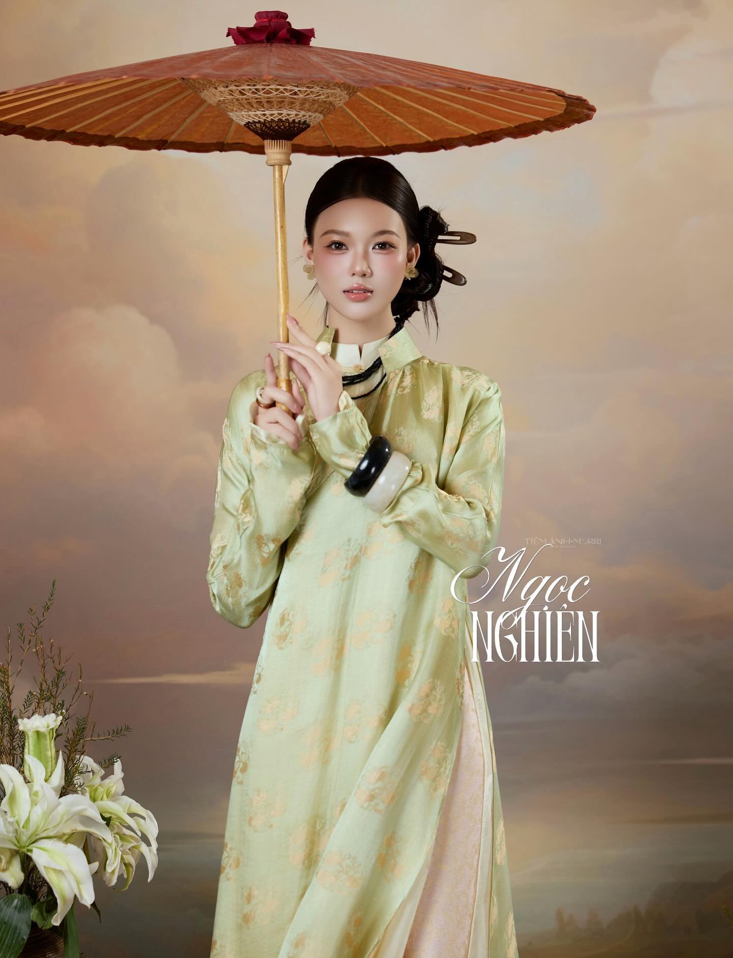 Lấy cảm hứng từ áo ngũ thân thời Nguyễn, Uyển San giữ trọn tinh thần nền nếp của trang phục xưa qua phom dáng chuẩn mực, kín đáo và cân xứng. Trên nền ấy, cách phối màu được xử lý tinh tế, nhẹ nhàng “phá cách” vừa đủ để tạo nên hơi thở mới – không phô trương, không lấn át, mà khơi gợi cảm giác tươi sáng và mềm mại cho tổng thể.